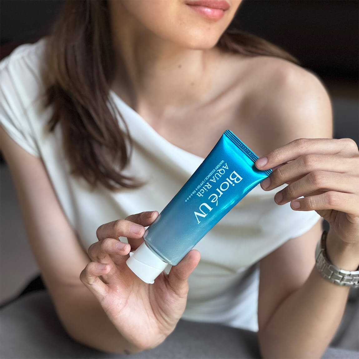 Biore UV Aqua Rich Watery Essence Sunscreen SPF50 PA ++++ ist ein erfrischender, leichter Sonnenschutz, der einen lang anhaltenden Schutz vor UV-Strahlen bietet. Das Produkt enthält Hyaluronsäure und eine Zitrusessenz, die den Feuchtigkeitsgehalt der Haut unter Kontrolle hält. Die essenzähnliche Textur zieht schnell ein und bietet eine angenehme Deckkraft für die tägliche Anwendung.